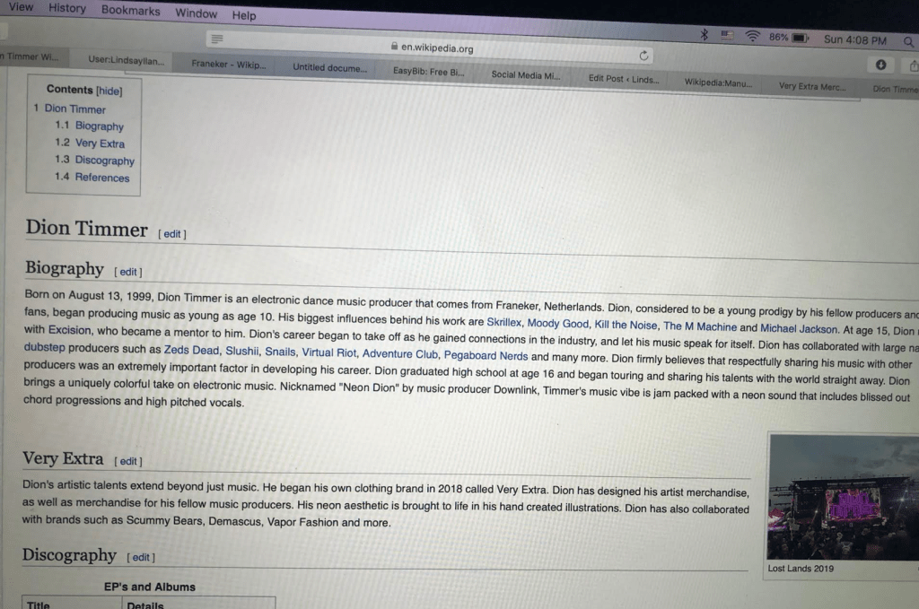 I chose to create my Wikipedia page on my favorite music producer, Dion Timmer. Dion is an electronic dance music producer that comes from Franeker, Netherlands. I have had the privilege of seeing him perform live last September, and have been one of his biggest fans ever since.