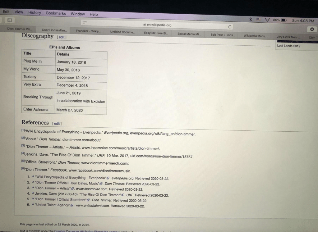 One challenge I ran into while creating Dion’s page was gaining an understanding of the editing tools on the sandbox service. It took me a little while to become familiar with how to format my page the right way. I needed to watch a YouTube tutorial of how to use each button in order to create a professional looking page. Another challenge I ran into while creating my page was citing sources. Since I chose to write my page on a music producer, I had to cite every single song and album that I listed under his discography.
